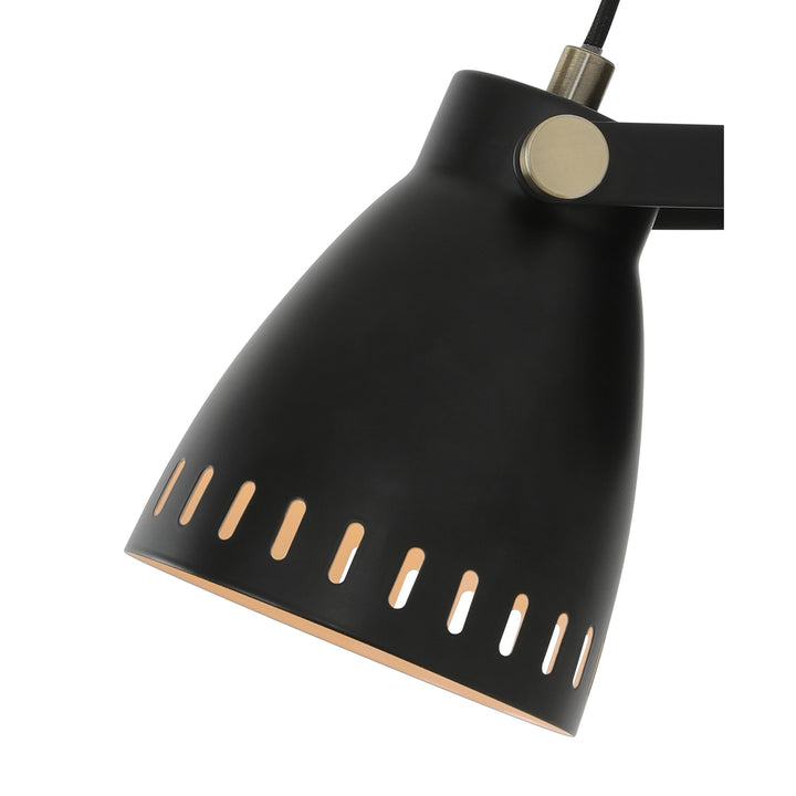 Bojam is a comprehensive range which awards a number of original features to a classic design concept. A familiar metal, narrow domed shade houses the E27 lamp holder on a selection of pendants and matching wall, table and floor lamp. Our designers have given these adjustable fixtures a modern twist firstly with the colour finishes of each component. The majority of the fittings have a matt black finish with the lamp holders and adjustable bolts coated in antique brass. The most unique colour is on the inside of each shade which has a khaki finish; in order to further accentuate this whilst also adding another feature, the edge around the outer rims of the shades have small oval cut outs to display the inner shade and create fascinating shadows when illuminated.