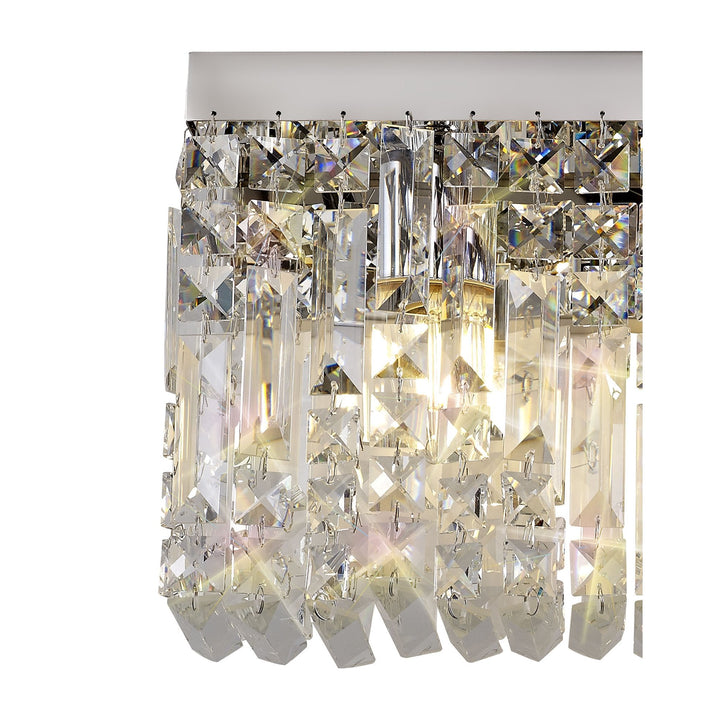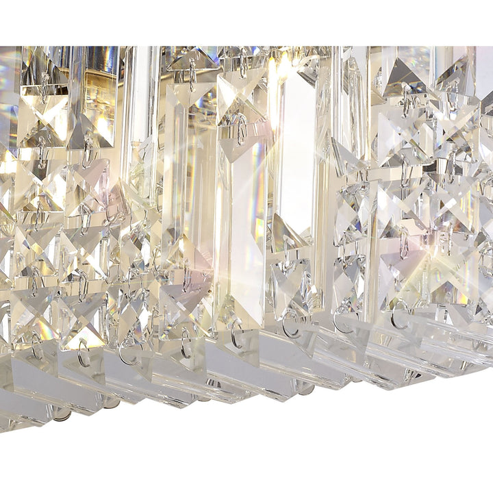 Zian is a prestigious collection of alluring crystal fixtures that enraptures its audience with the exceptional dazzling quality of each piece of clear crystal. From 1m rectangular pendants to 45cm round flush lights each impressive design is available in either a polished chrome or gold finish. The striking strands of crystal hang either side of the E14 lamp holders and are joined beneath them with additional rectangular crystal pieces, to conceal the lamps used and heighten the sparkle demonstrated when illuminated.